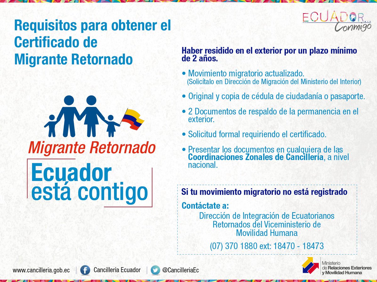 Solicita el Certificado de #MigranteRetornado en las Coordinaciones Zonales de @CancilleriaEc a nivel nacional: http://bit.ly/2sF9Vz5 pic.twitter.com/0i1PRIzr28