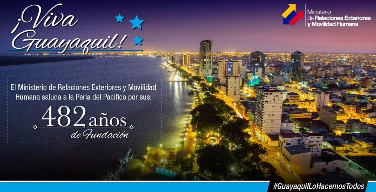 Enviamos un fraterno saludo a #Guayaquil, la Perla del Pacífico, en sus 482 años de fundación. ¡Viva Guayaquil! #GuayaquilLoHacemosTodospic.twitter.com/i1u2DU6FjO