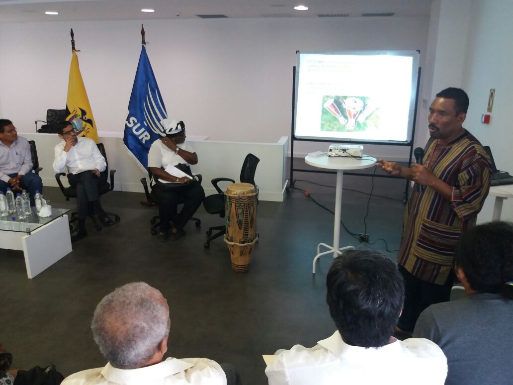 Limber Valencia, artista ecuatoriano, expone en este momento en la Mesa sobre Interculturalidad y #DDHH que se desarrolla en #Esmeraldas.pic.twitter.com/WE2qO7jWJA
