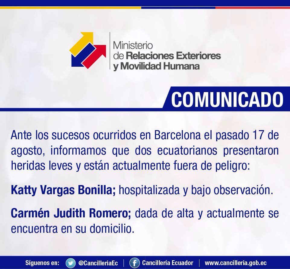 Informamos que los dos ciudadanos ecuatorianos que presentaron heridas leves en los sucesos en #Barcelona están actualmente fuera de peligropic.twitter.com/LHa3pTRFGX