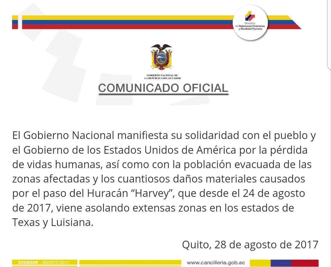 Ecuador expresa su solidaridad con los #EEUU por las víctimas y pérdidas materiales causadas por huracán #Harvey