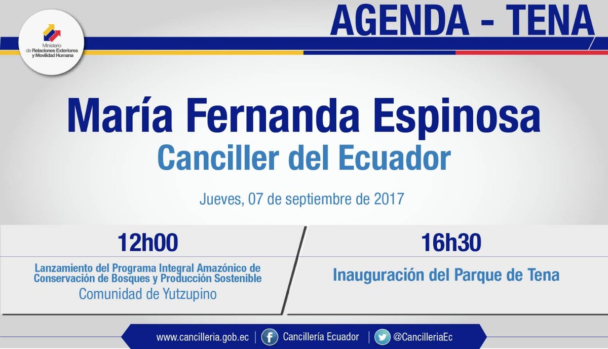La Canciller @mfespinosaEC cumplirá agenda en la provincia del #Napo y participará en la presentación del #ProgramaAmazónicopic.twitter.com/50S9Yudcf3