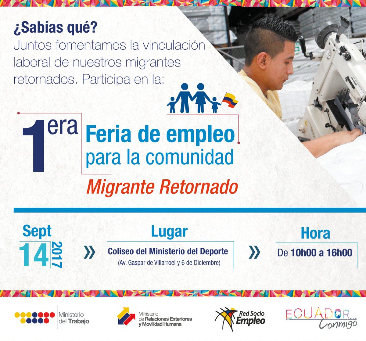 Jueves - 10h00 ➤ Asiste a 1era Feria de Empleo para Migrantes Retornados, a realizarse en coliseo del @DeporteEc ¡Acude con tu hoja de vida!pic.twitter.com/KludS3akV4