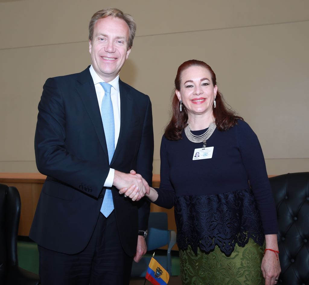 Ahora ➤ Canciller @mfespinosaEC mantuvo reunión con su par de #Noruega @borgebrende en el marco de la 72 #UNGA #EcuadorEnONU