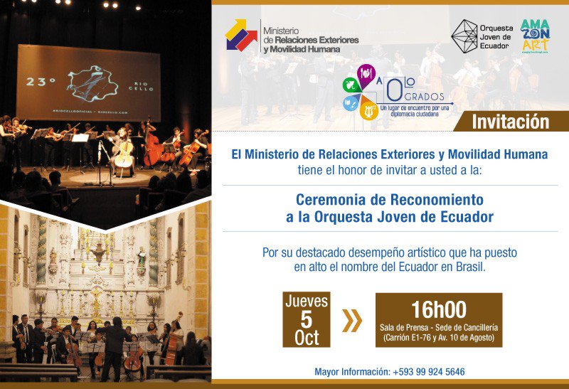 #Agenda 16h00 | Invitamos a la ceremonia de reconocimiento a la Orquesta Joven del Ecuador 🇪🇨 en @CancilleriaEc #A0Gradospic.twitter.com/uHh3ORnJC8