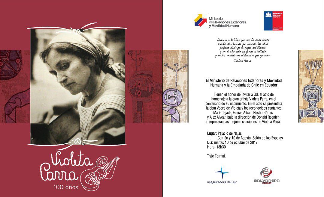 #Ahora | Inicia homenaje por los 100 años del natalicio de Violeta Parra en @CancilleriaEc | #VioletaParra100 #A0Gradospic.twitter.com/0MrumVinIb