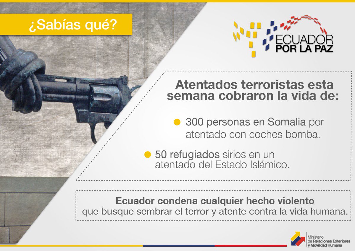 | Condenamos atentados en #Somalia y #Siria. Rechazamos actos violentos que busquen sembrar el terror y cobren vidas.pic.twitter.com/pWOcnnLURZ