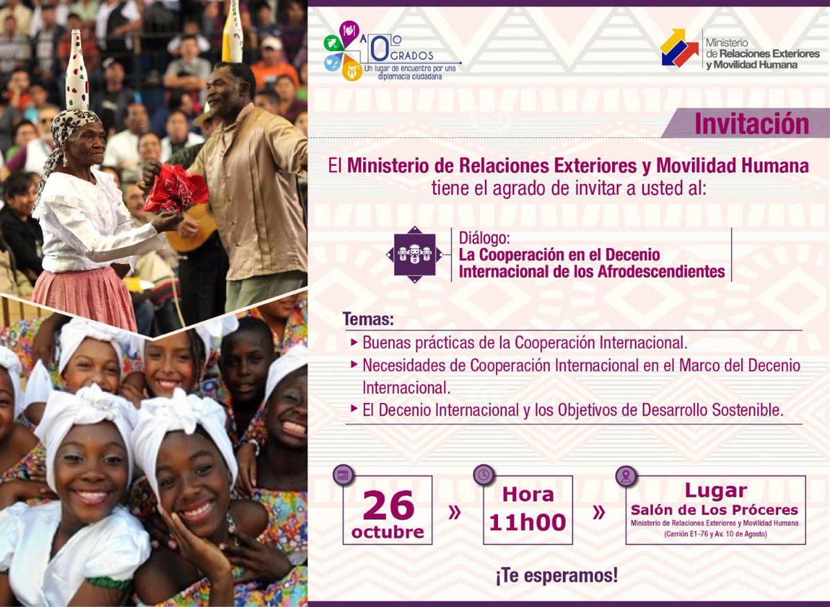 Jueves - 11h00 ➤ Te invitamos al diálogo: La Cooperación en el Decenio Internacional de los Afrodescendientes. ¡Te esperamos!pic.twitter.com/1i7jRB7FDU