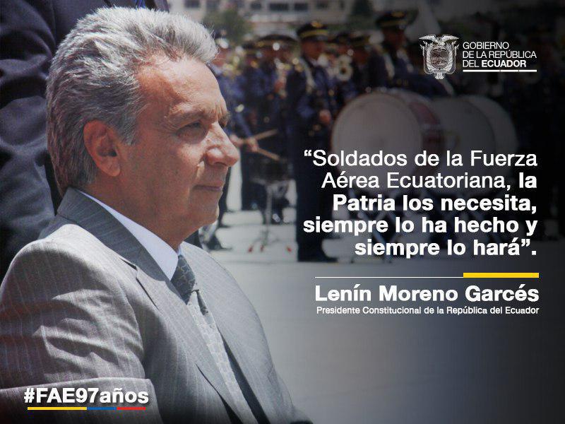 Presidente @Lenin Moreno felicita labor de la @FuerzaAereaEc por un Ecuador libre y soberano. #FAE97añospic.twitter.com/TEQLPLpg4G