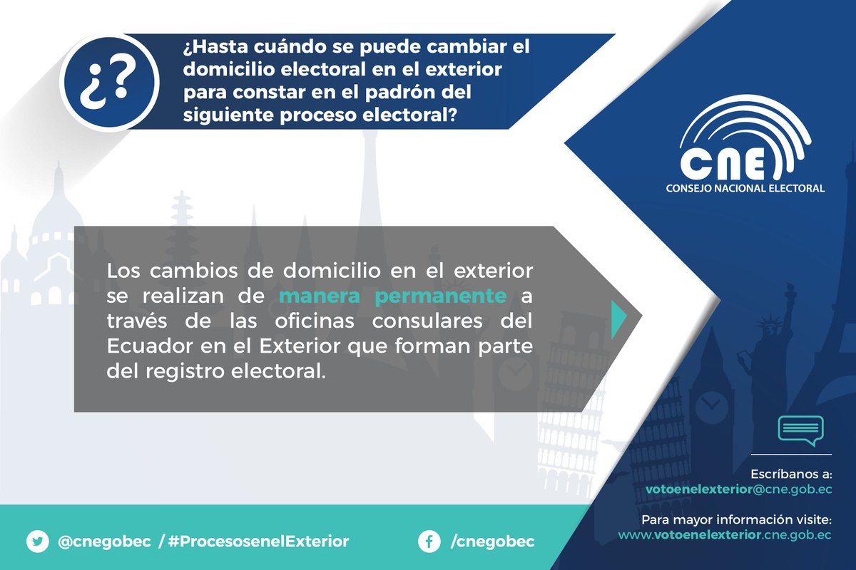 Compatriota en el exterior recuerda que puedes actualizar tu domicilio electoral en los consulados del Ecuador ➤ https://goo.gl/9aUM0G pic.twitter.com/9DHo0WAG8R