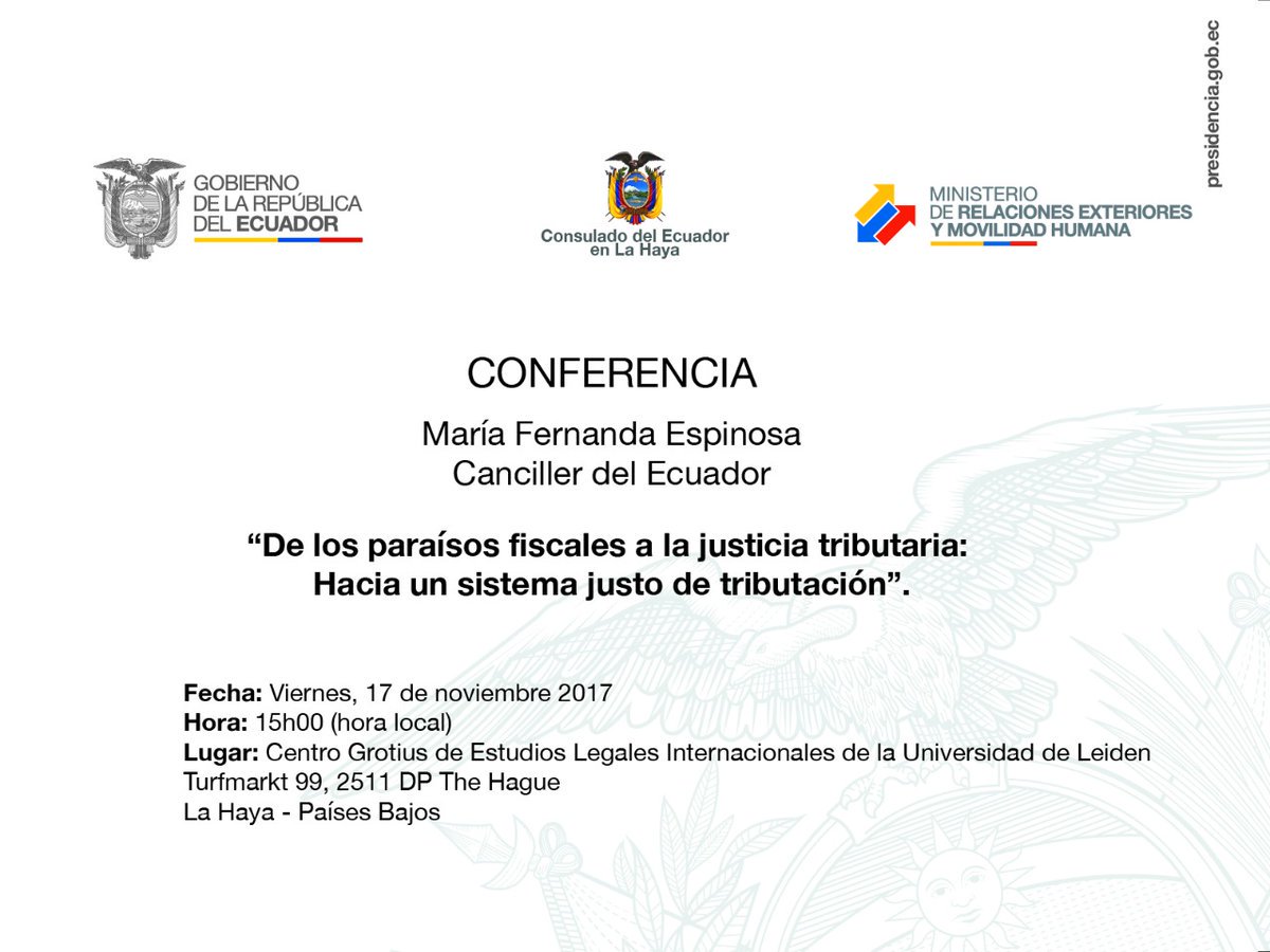 Canciller @mfespinosaEC ofrecerá conferencia: "De los Paraísos Fiscales a la Justicia Tributaria: Hacia un Sistema Justo de Tributación" Viernes, 17 de noviembre en @UniLeiden en #LaHaya - Países Bajos