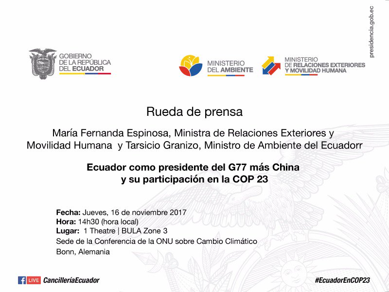 como presidente del G77 + China y su participación en la #COP23 desde Bonn 14h30 (hora local) #EcuadorEnCOP23pic.twitter.com/LoTuYHUhUk