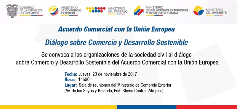 Agenda 23 Nov | Se convoca a la sociedad civil al diálogo sobre Comercio y Desarrollo Sostenible del Acuerdo Comercial con la @UEenEcuador en el ministerio de @ComercioExtEc. Más información en