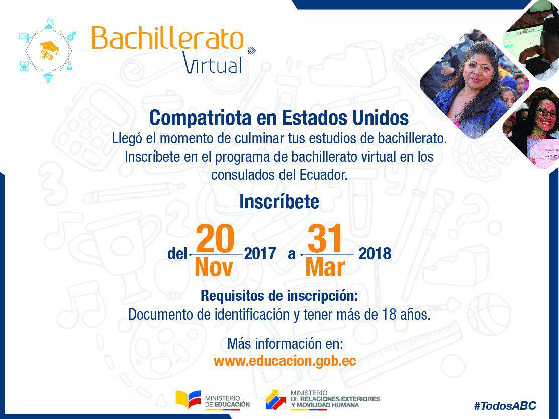 #TodosABC | Compatriota en #EEUU accede al programa de bachillerato virtual y culmina tus estudios. Inscríbete del 20 de noviembre al 31 de marzo en los consulados del Ecuador. #EcuadorConmigopic.twitter.com/udsmIa76Kf