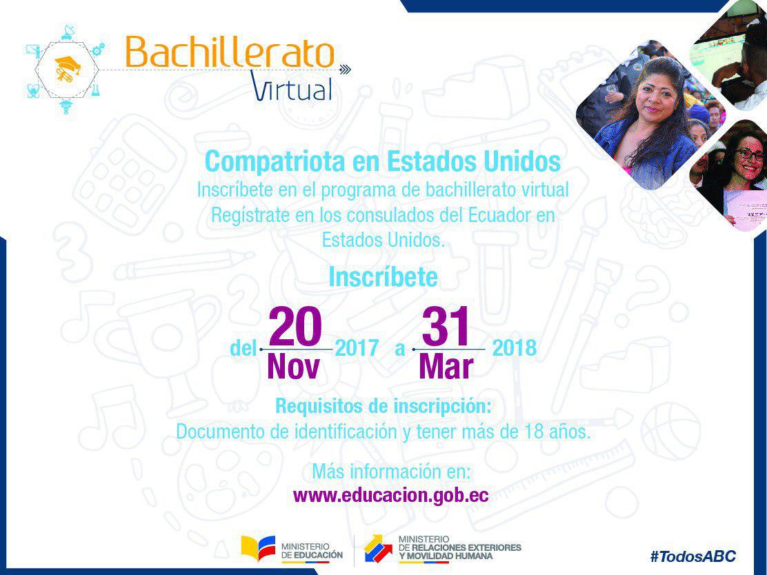 Compatriota en #EEUU terminar tu educación está en tus manos. Inscríbete en la oferta de Bachillerato Virtual en los consulados del Ecuador. #EcuadorConmigopic.twitter.com/AfsCHro6mD