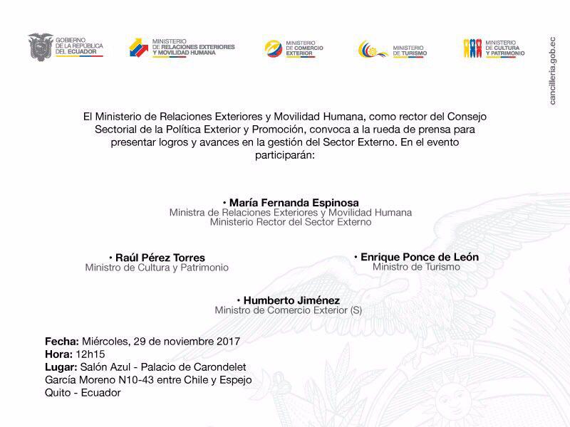 Hoy - 12h15 | Rueda de prensa de @CancilleriaEc, @TurismoEc, @Cultura_Ec y @ComercioExtEc sobre los logros y avances del sector externo. Facebook Live ➤ http://bit.ly/cancilleriafb | #6MesesDeLogrospic.twitter.com/Tc62hm03Ok