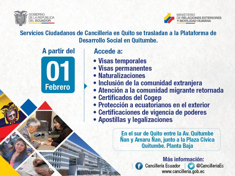 Importante | Servicios ciudadanos de @CancilleriaEc en Quito se trasladan a la Plataforma de Desarrollo Social en #Quitumbe, a partir del 01 de febrero. #ServiciosCancilleríapic.twitter.com/7q6u6PQms8