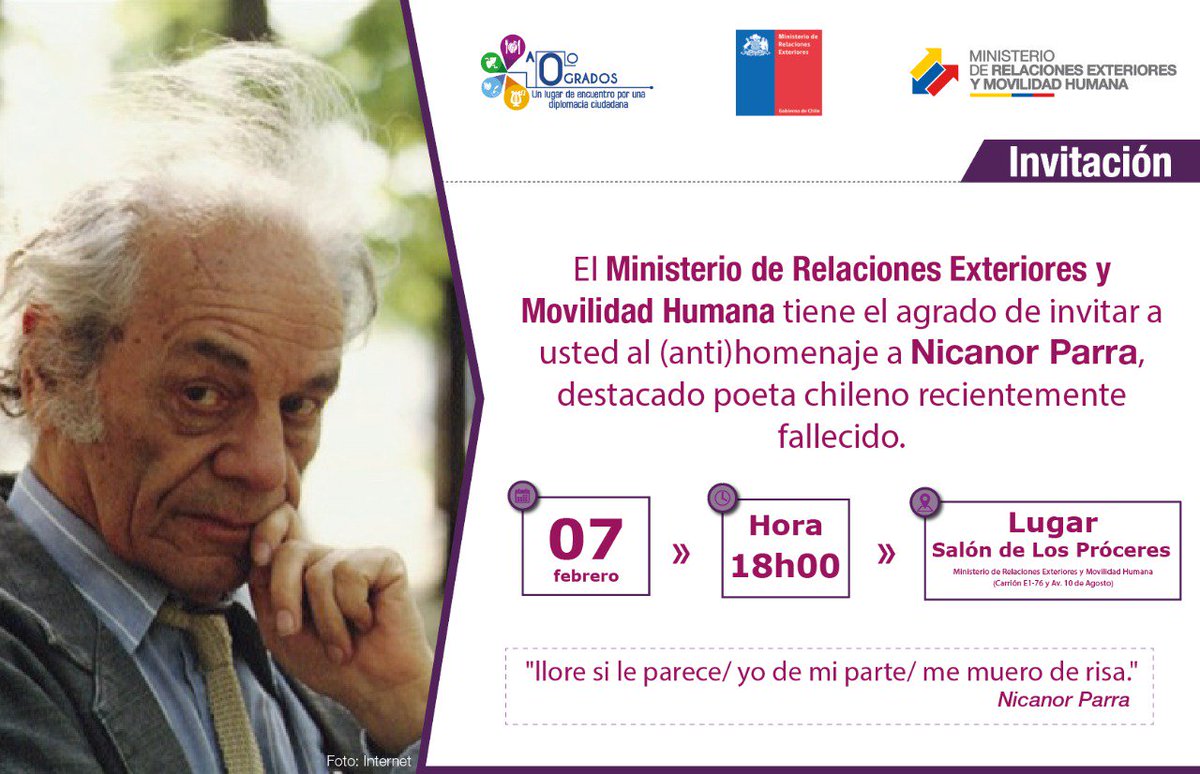.@CancilleriaEc te invita al (anti) homenaje en honor al reconocido poeta chileno #NicanorParra. Asiste este miércoles, 7 de febrero, a las 18h00. #A0Gradospic.twitter.com/7FTn3ecyeo