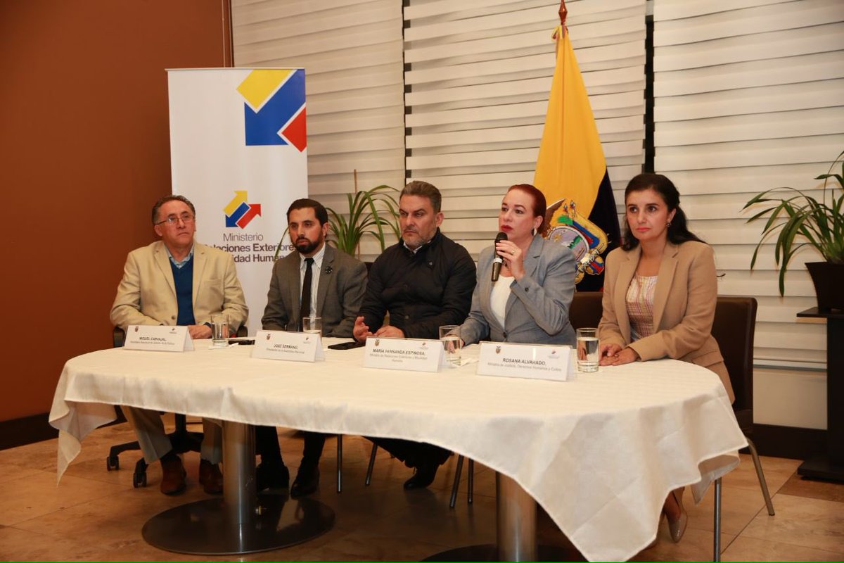 #Ahora | Canciller @mfespinosaEC junto a @alvaradorosana, @MCarvajal_A, @ppsesa y miembros de la delegación ecuatoriana que viajó a Costa Rica, ofrecen rueda de prensa desde Tababela.pic.twitter.com/rizl6TpUFm