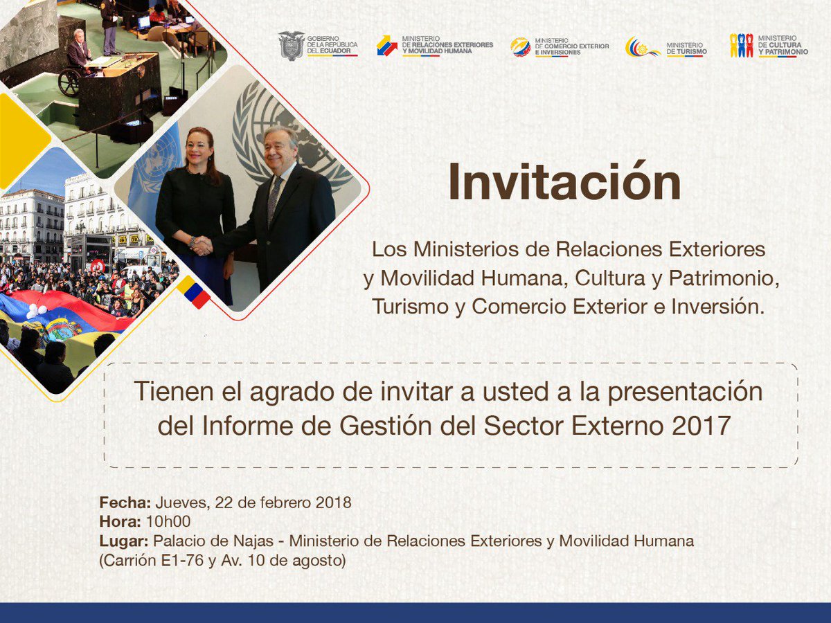 Jueves 22 de febrero | @CancilleriaEc, @Cultura_Ec, @TurismoEc y @ComercioExtEc invitan a la presentación del Informe de Gestión del Sector Externo 2017. ¡Te esperamos! #RendiciónDeCuentas2017pic.twitter.com/aWxQDpb8C1