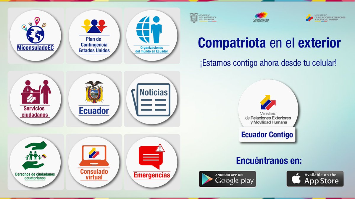Compatriota en el exterior ➤ @CancilleriaEc pone a tu disposición la app 'Ecuador Contigo'. Descárgala en tu celular y accede a toda la información de tu interés. #EcuadorConmigopic.twitter.com/xe9qZ7kHAU