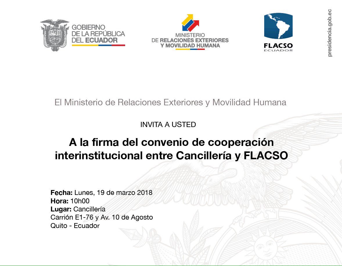 Hoy - 10h00 | Firma de convenio de cooperación interinstitucional entre @CancilleriaEc y @FLACSOec. #PolíticaExteriorEcpic.twitter.com/w3VHsrE858