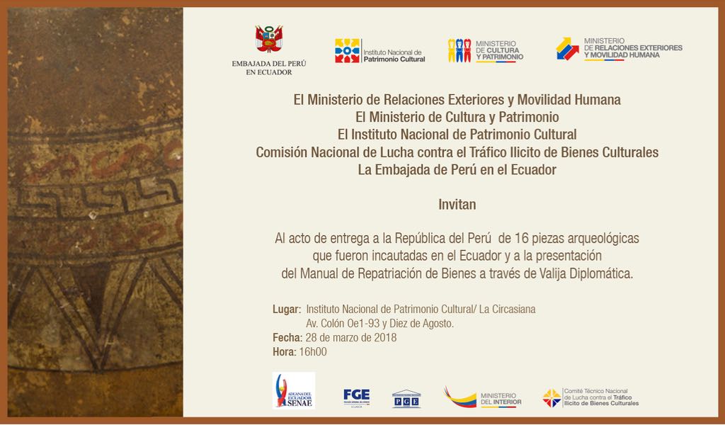 Miércoles - 16h00 | @CancilleriaEc, @Cultura_Ec, @INPCEcuador invitan al acto de entrega de 16 piezas arqueológicas a la República del Perú