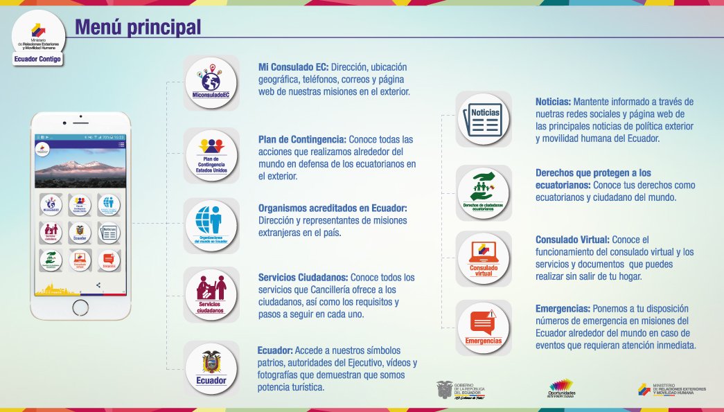 Fácil de usar y con toda la información que requieres en el exterior. 📲'Ecuador Contigo' disponible en Google Play: http://bit.ly/2FzRo0F  y AppStore: https://apple.co/2HAP0Dh  #EcuadorConmigopic.twitter.com/BEbrPCvpQG