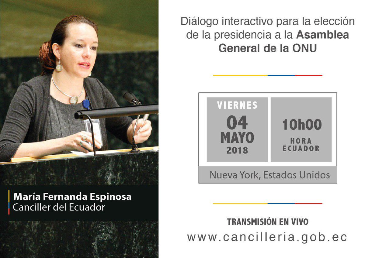 #Ahora | Inicia la presentación de la canciller @mfespinosaEC en el diálogo interactivo para la elección de la presidencia a la Asamblea General de @ONU_es.
