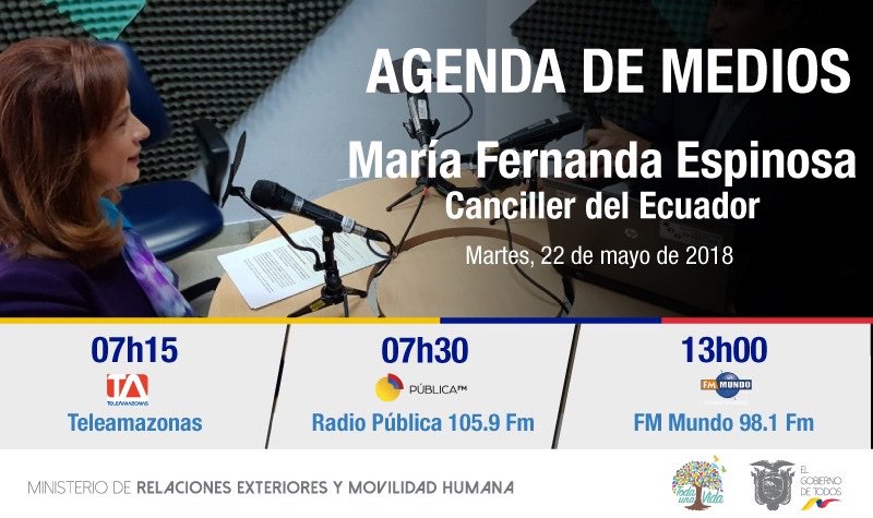 #Entrevista | Compartimos la agenda de medios de la Canciller @mfespinosaEC este martes, 22 de mayo, en @teleamazonasec, @PublicaFM y @fmmundo #PolíticaExteriorEcpic.twitter.com/HsPYA4sbvG