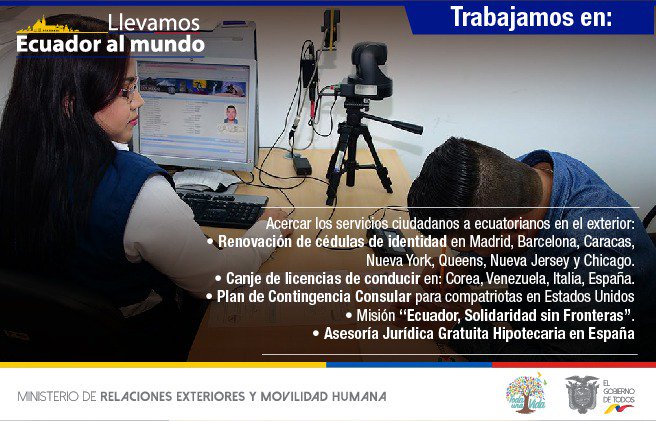 Acercamos los servicios ciudadanos a ecuatorianos en el exterior e implementamos nuevos programas de apoyo a la comunidad ecuatoriana en el mundo. #ElPrimerAñoDeTodospic.twitter.com/MIKgokxe33