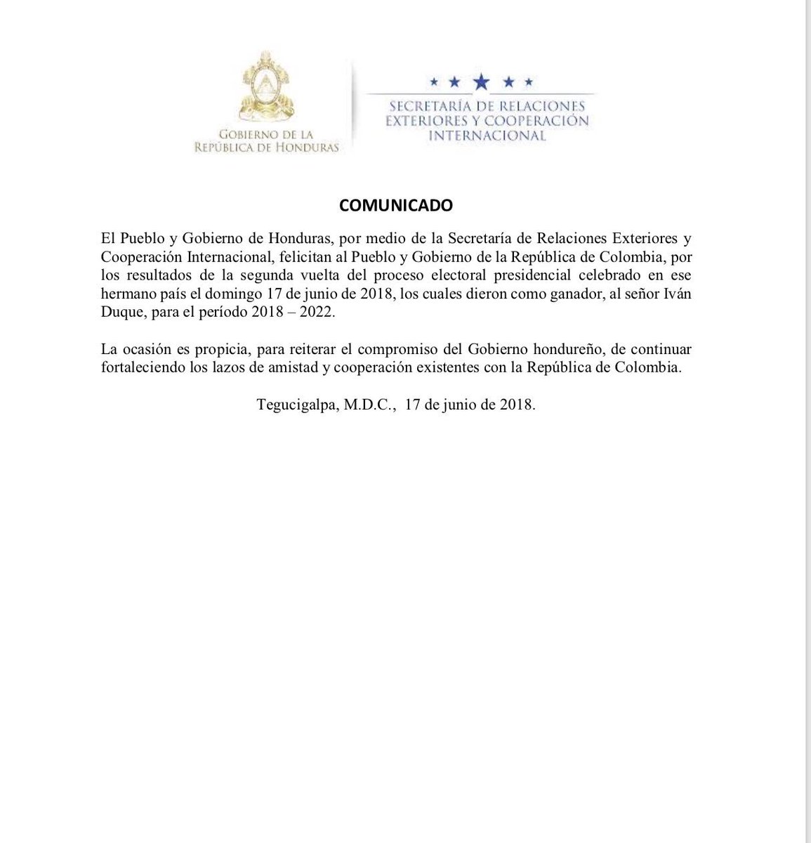 Cancillería Honduras‏ @CancilleriaHN Jun 17