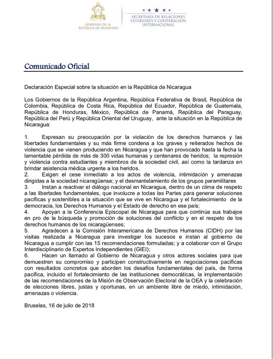 Declaración especial de Honduras, Chile, Argentina, Costa Rica, Guatemala, Ecuador,Colombia, Brasil,México, Panamá, Paraguay, Perú y Uruguay, ante la situación de #Nicaraguapic.twitter.com/0cD8a9HHrg