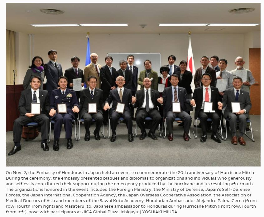 #Tokio. El diario japones #TheJapanTimes destaca reconocimiento de la embajada de Honduras a personas e instituciones japonesas que volcaron su apoyo al país tras el paso del #HuracanMitch. https://bit.ly/2zG1zuN pic.twitter.com/2ZDqbKlQai