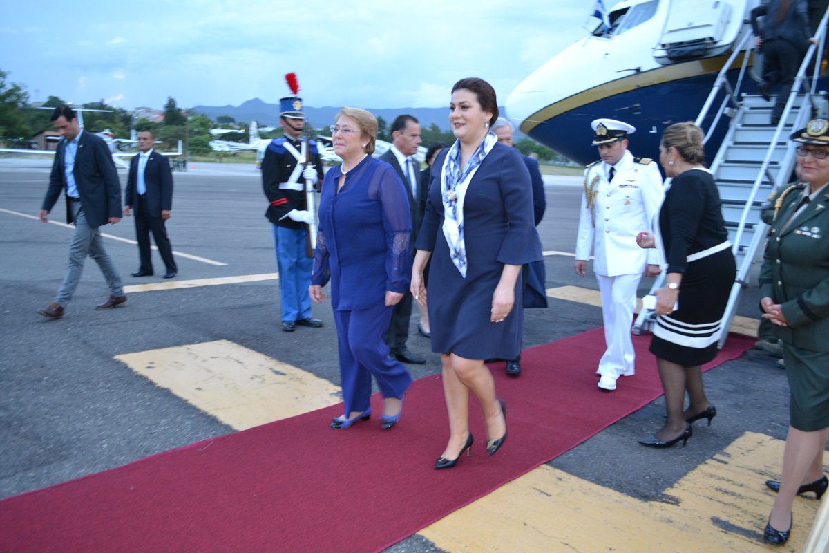 Canciller María Dolores Agüero Lara recibe a la señora Michelle Bachelet, Presidente de la República de Chile durante su arribo a Honduras.pic.twitter.com/VKe879dXvo