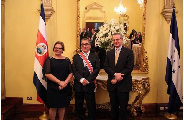 Canciller de Costa Rica, en representación del gobierno de ese país, condecoró al embajador de Honduras, Juan Alberto Lara Bueso quien después de cuatro años de trabajo finalizó su misión diplomáticapic.twitter.com/vgrB0vhohh