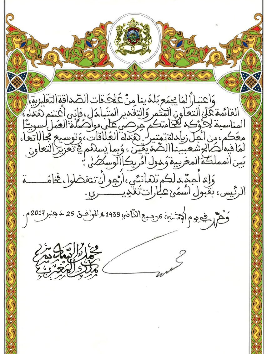 Carta de felicitación del Rey de Marruecos, Mohammed VI dirigida al Presidente @JuanOrlandoH.pic.twitter.com/bP4K9F21nv