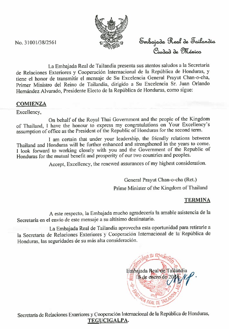 GRACIAS AL PRIMER MINISTRO DEL REINO DE TAILANDIA POR EL RECONOCIMIENTO DEL PRESIDENTE REELECTO DE HONDURAS JUAN ORLANDO HERNANDEZ ELECTO DEMOCRATICA MENTE POR EL PUEBLO HONDUREÑO POR 4 AÑOS MAS APARTIR DEL 27 DE ENERO 2018 2022 MAS PAISES DEL MUNDO SE SUMAN AL RECONOCIMIENTO