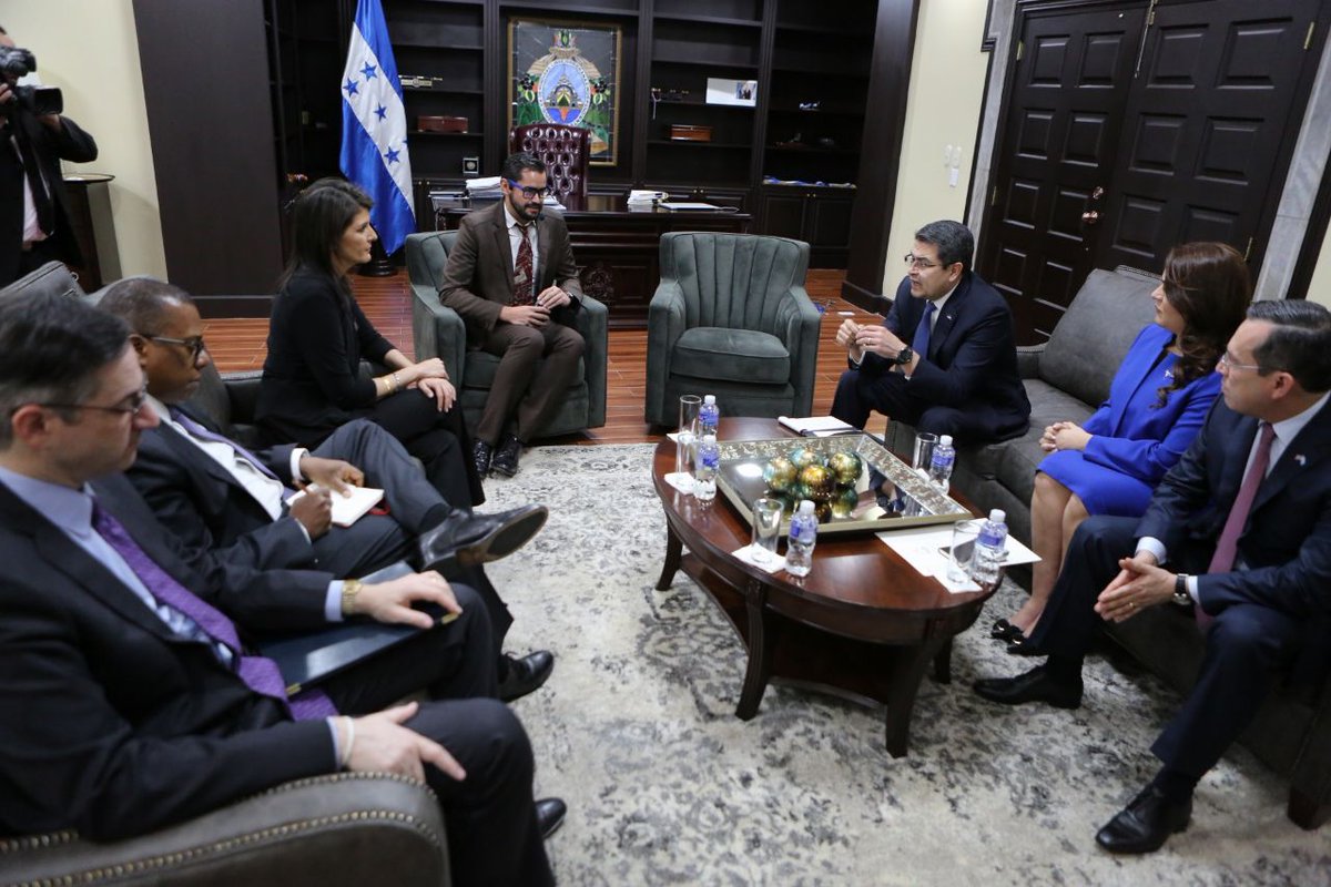 Inicia reunión entre presidente Hernández y embajadora de Estados Unidos ante la ONU El presidente Juan Orlando Hernández recibió este martes en Casa de Gobierno, a la embajadora de Estados Unidos en la Organización de Naciones Unidas (ONU), Nikki Haley.pic.twitter.com/IMSrKrhWOO