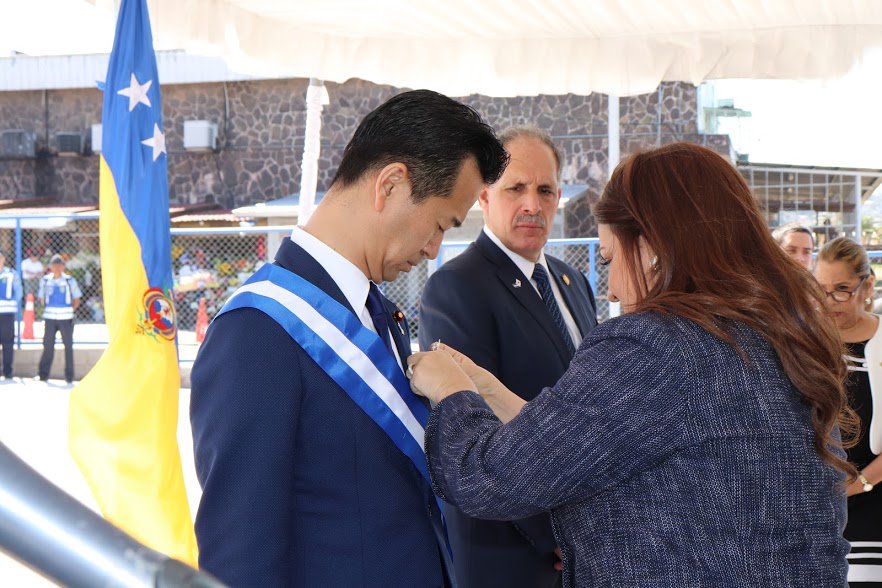 La ceremonia se celebró en la recién inaugurada Plaza Japón ubicada frente a la Basílica de Suyapa, donde la Canciller hondureña, María Dolores Agüero, impuso la condecoración al diplomático.pic.twitter.com/fXh6K3wkM7