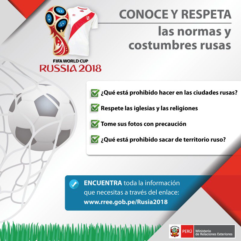 ⚽️ Haz de tu viaje a #Rusia2018 una experiencia agradable para todos. Respeta las normas y costumbres rusas. Encuentra esta y más información en ▶️ http://bit.ly/RecomendacionesRusia2018 …pic.twitter.com/3GwcCPWoaV