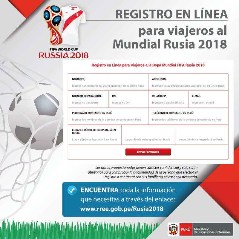 #HinchaPeruano Si viajas a #Rusia2018 regístrate en nuestro formulario en línea para poder ayudarte en caso de emergencia http://www.rree.gob.pe/Rusia2018 pic.twitter.com/yN9gIOZRDC