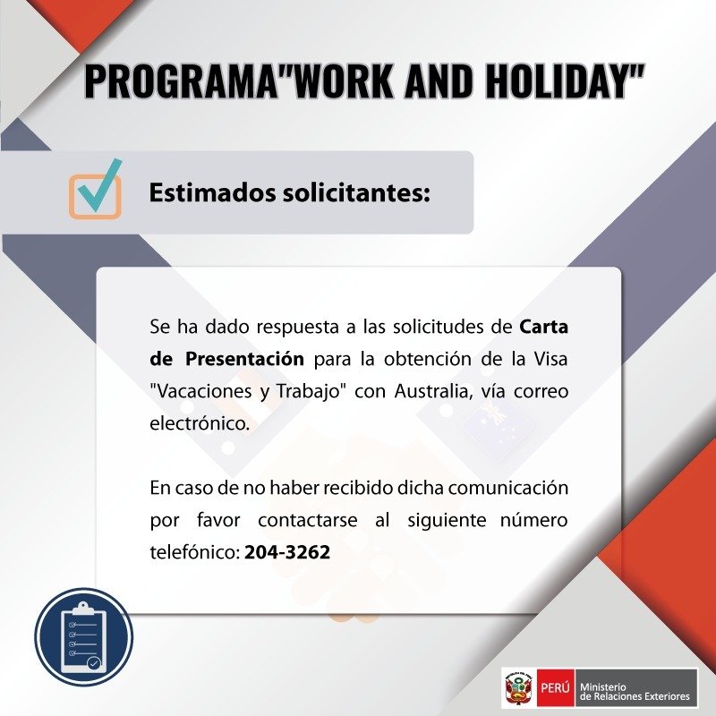 ! Se ha dado respuesta a las solicitudes de Carta de Presentación para la obtención de la Visa "Vacaciones y Trabajo" con Australia, vía correo electrónico.pic.twitter.com/CqXhzLJgFj