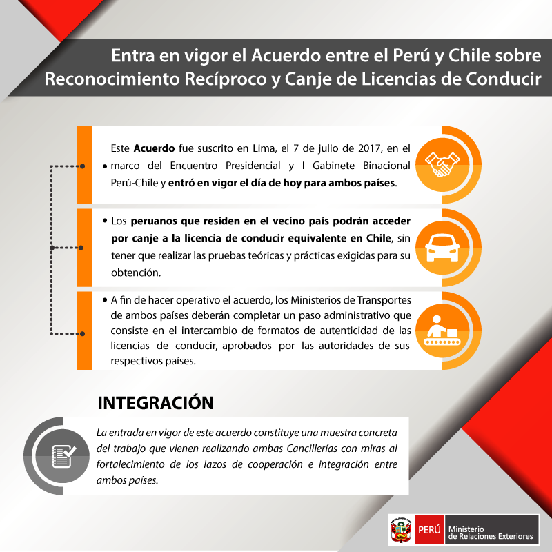 Entra en vigencia el Acuerdo entre Perú y Chile sobre reconocimiento recíproco y canje de licencia de conducir.