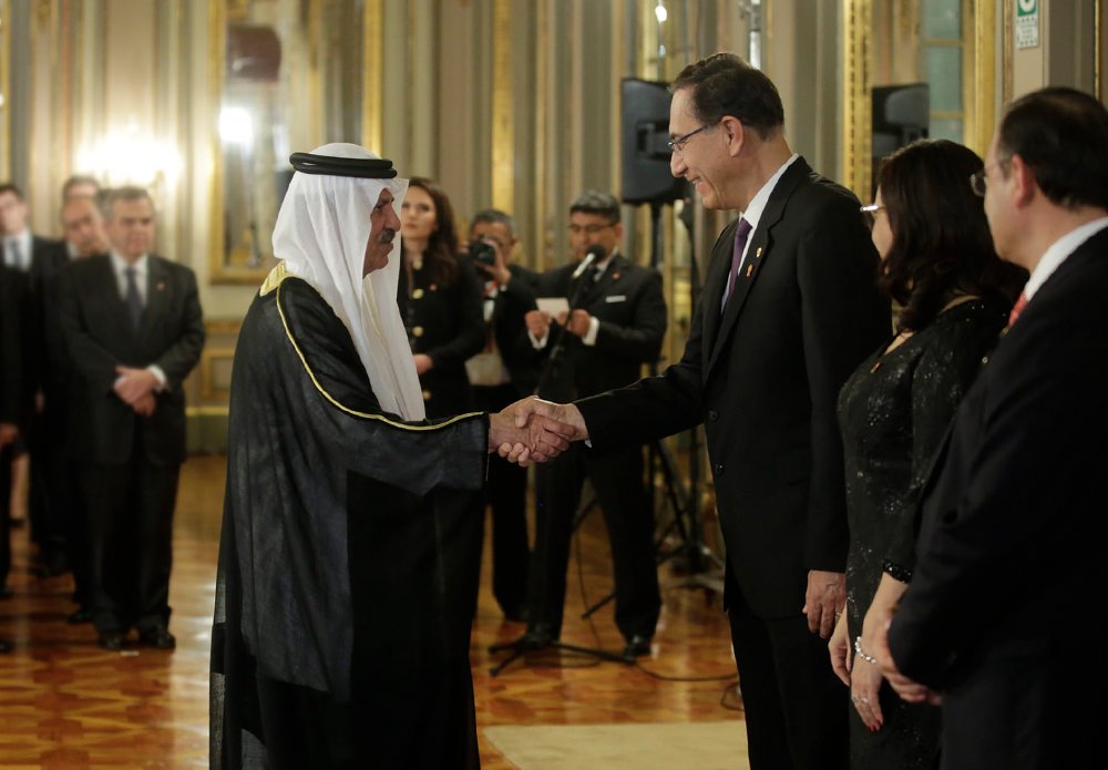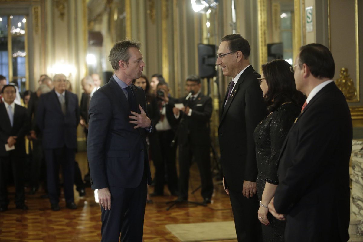 Presidente @MartinVizcarraC, acompañado del canciller @NestorPopolizio, recibió el saludo del cuerpo diplomático acreditado en el Perú con motivo del 197.° aniversario de nuestra independencia. #FiestasPatriaspic.twitter.com/JSuFqC83J4