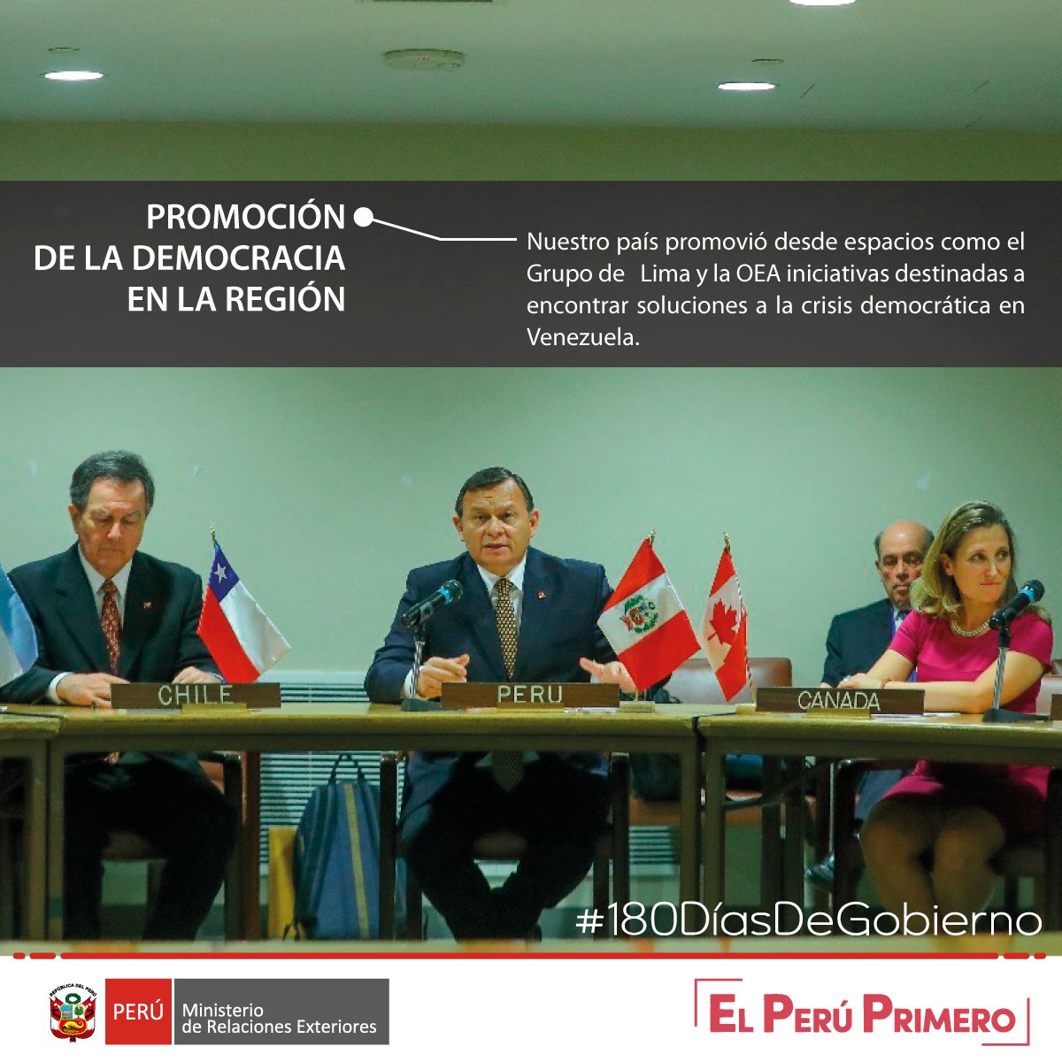 , desde espacios como el Grupo de Lima y la OEA, promueve acciones destinadas a encontrar soluciones democráticas en países como Venezuela y Nicaragua.