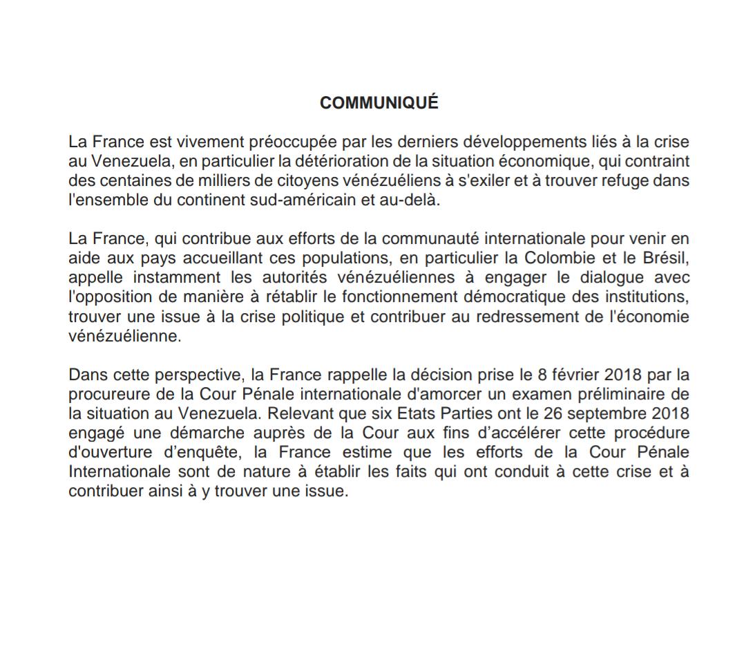 Texto del comunicado de Francia sobre la iniciativa de seis países de llevar la situación de Venezuela a la Corte Penal Internacional.pic.twitter.com/ljEMVCpzk8