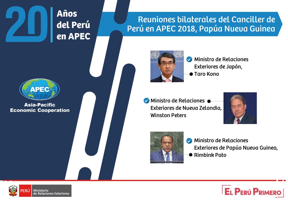 En marco del fortalecimiento de las relaciones de #Perú con las economías miembro de @APEC, el Canciller @NestorPopolizio, sostendrá las siguiente reuniones bilaterales: