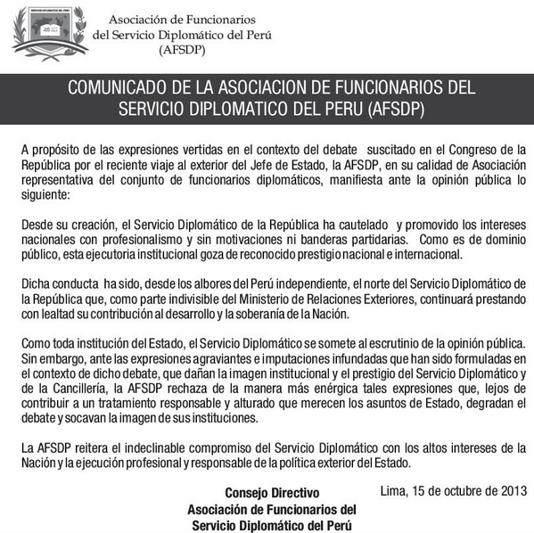 Comunicado de la Asociación de Funcionarios del Servicio Diplomático del #Perúpic.twitter.com/LiMl2pIACz