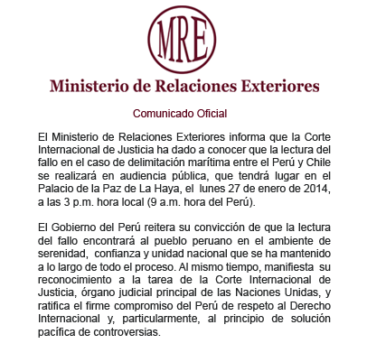 Comunicado de la @CancilleriaPeru sobre lectura del fallo en el caso de delimitación marítima #Perú y #Chile #LaHayapic.twitter.com/kKqIqNSz8C